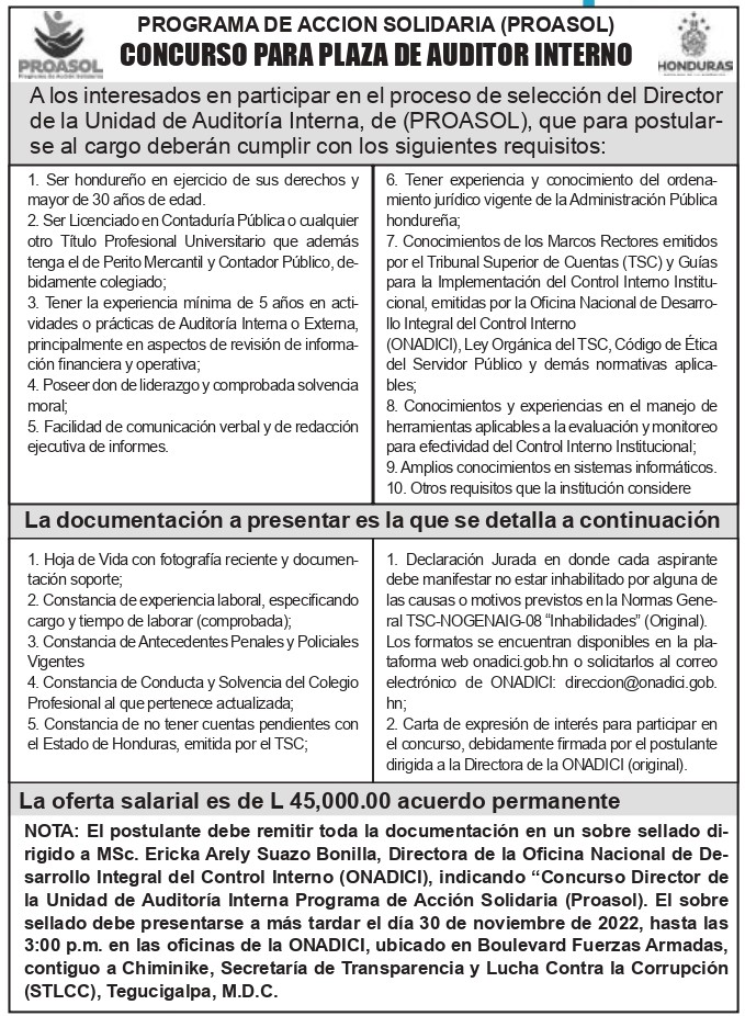 Concurso público para plaza de Auditor Interno de el Programa de Acción Solidaria (PROASOL) el postulante debe remitir toda la documentación en un sobre sellado dirigido a la Msc. Ericka Arely Suazo Bonilla Directora de la ONADICI, a mas tardar el 30 de Noviembre de 2022 a las 3:00 p.m.