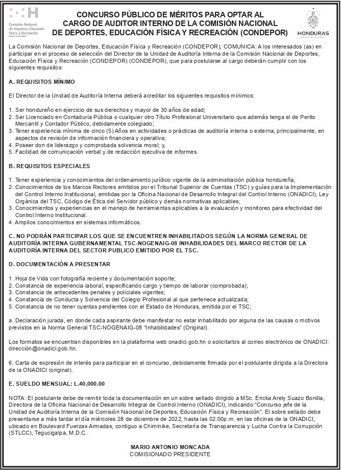 Concurso público de méritos para optar al cargo de auditor interno de la Comisión Nacional de Deportes, Educación Física y Recreación (CONDEPOR) el postulante debe remitir toda la documentación en un sobre sellado dirigido a la Msc. Ericka Arely Suazo Bonilla Directora de la ONADICI, a mas tardar el 28 de Diciembre de 2022 hasta las 2:00 p.m., en las oficinas de la ONADICI, ubicado en el Boulevard Fuerzas Armadas, contiguo a Chiminike, Secretaría de Transparencia y Lucha Contra la Corrupción (STLCC), Tegucigalpa, M.D.C.