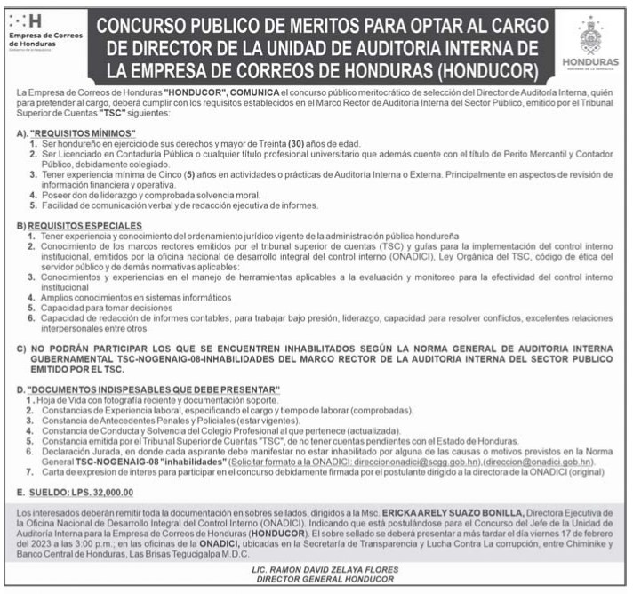 Concurso Público de Méritos para Optar al Cargo de Director de la Unidad de Auditoría Interna de la Empresa de Correos de Honduras (HONDUCOR), el postulante debe remitir toda la documentación en un sobre sellado dirigido a la Msc. Ericka Arely Suazo Bonilla Directora de la ONADICI, a mas tardar el 17 de Febrero de 2023 hasta las 3 p.m., en las oficinas de la ONADICI, ubicado en el Boulevard Fuerzas Armadas, contiguo a Chiminike, Secretaría de Transparencia y Lucha Contra la Corrupción (STLCC), Tegucigalpa, M.D.C.