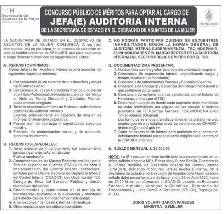 Concurso Público de Méritos para optar al cargo de Jefe de la Unidad de Auditoría Interna de la Secretaría de Estado en el Despacho de Asuntos de la Mujer (SEMUJER), el postulante debe remitir toda la documentación en un sobre sellado dirigido a la Msc. Ericka Arely Suazo Bonilla Directora de la ONADICI, a mas tardar el 28 de Abril a las 12:00 m de 2023, en las oficinas de la ONADICI, ubicado en el Boulevard Fuerzas Armadas, contiguo a Chiminike, Secretaría de Transparencia y Lucha Contra la Corrupción (STLCC), Tegucigalpa, M.D.C.