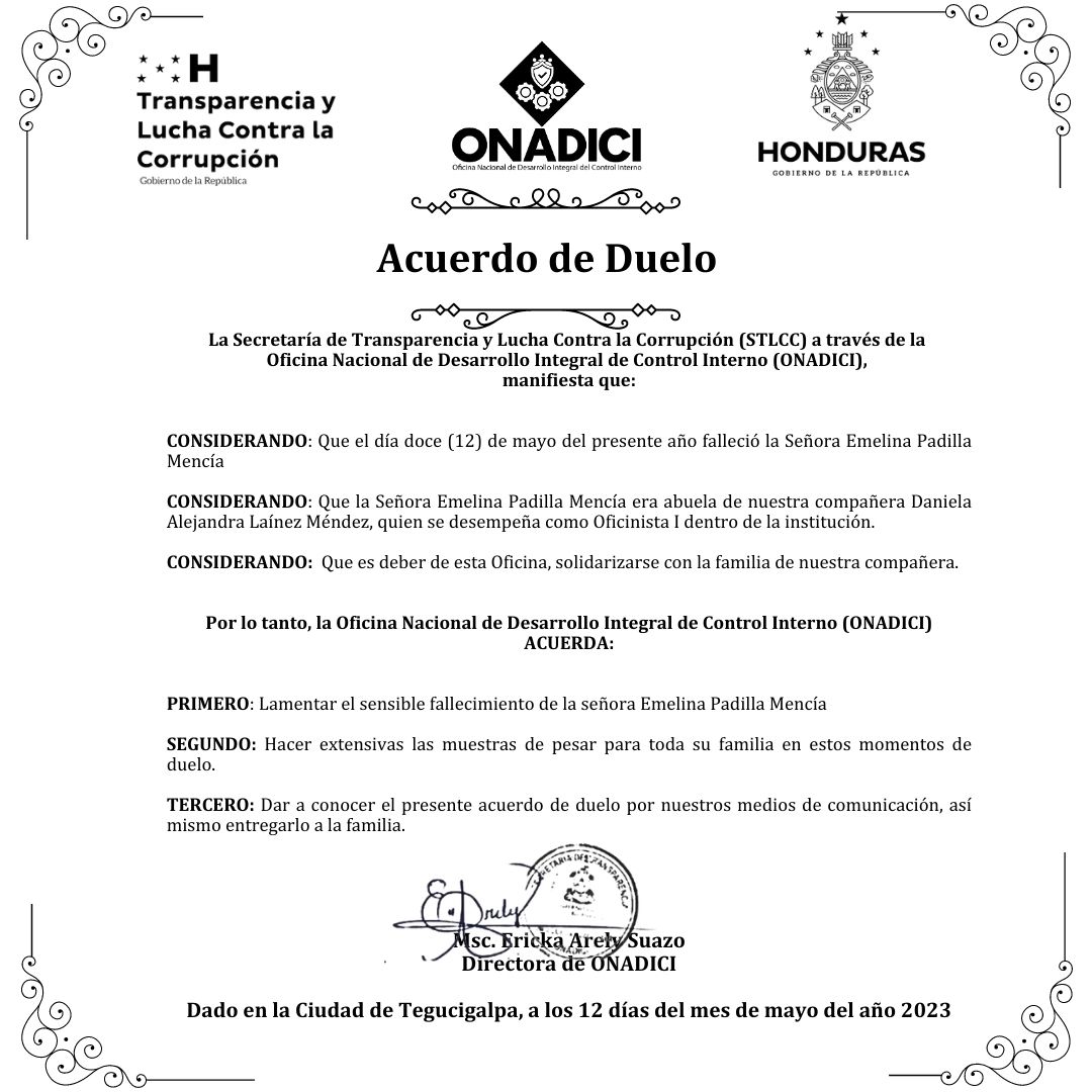 La Oficina Nacional de Desarrollo Integral del Control Interno (ONADICI) da a conocer el siguiente Acuerdo de Duelo que refiere: