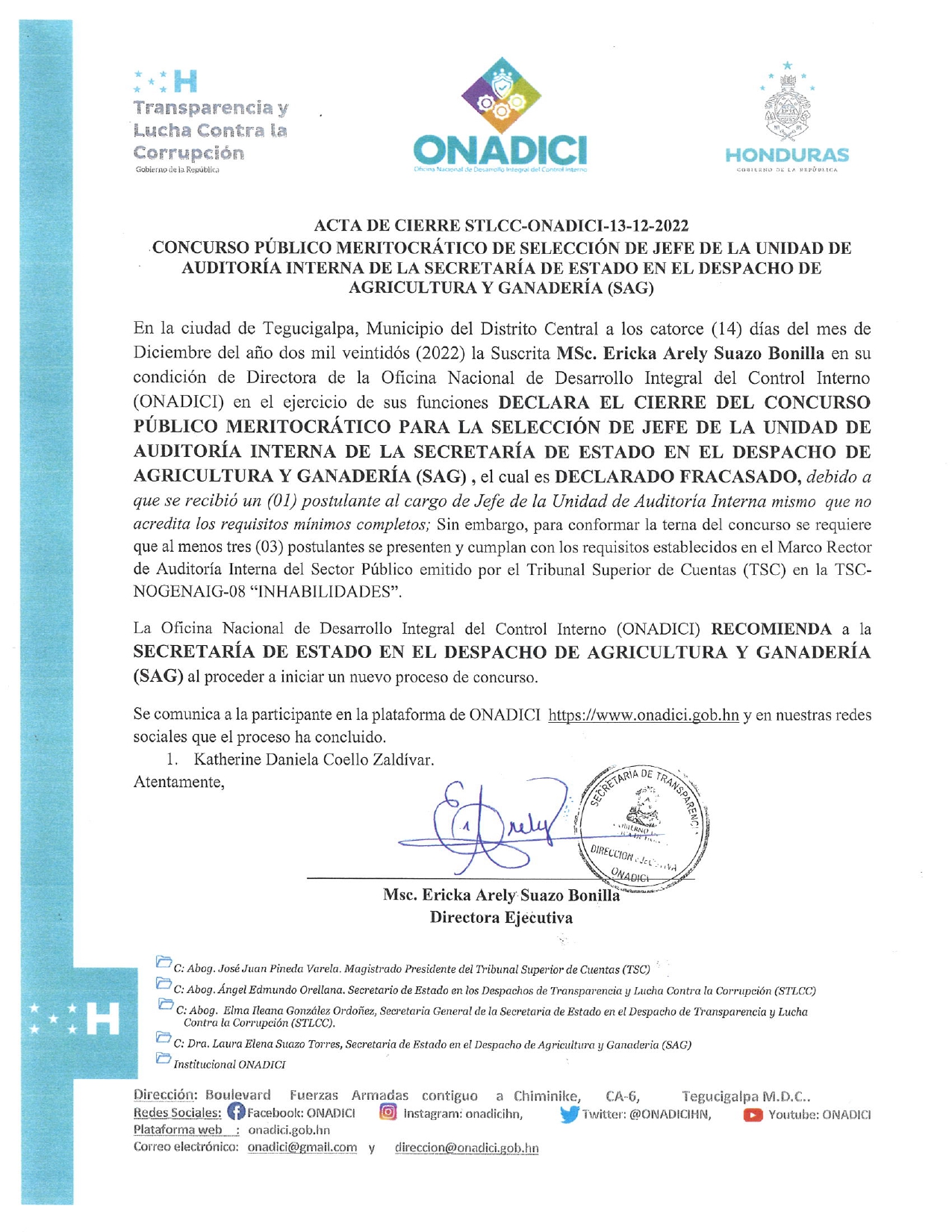 Acta de Cierre STLCC-ONADICI-13-12-2022 Concurso Publico Meritocrático de Selección de Jefe de la Unidad de Auditoria Interna de la Secretaría de Agricultura y Ganadería (SAG)